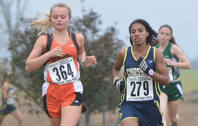 PHOTOS: (Top) Marquette’s Lindsey Rudden (left) runs stride for stride with Negaunee’s Clara Johnson before breaking away for the Division 1 championship. (Middle) Ishpeming’s Khora Swanson sprints the stretch in first place in leading the Hematites to their second straight title. (Below) Newberry’s Natalie Beaulieu won her second straight individual title in Division 3, while Chassell’s Shitaye Sam led her team to its second straight team championship. (Photos by Cara Kamps.)