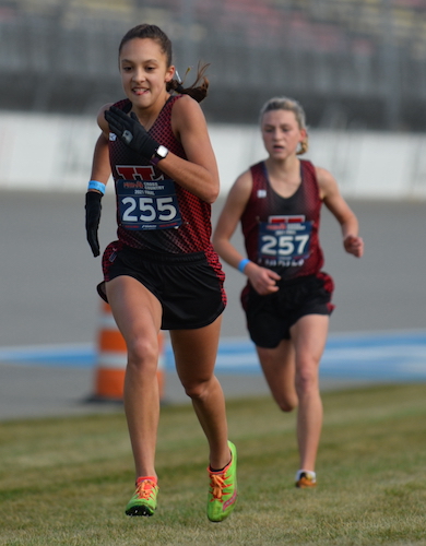 PHOTOS (Top) Ithaca’s Lani Bloom approaches the finish line on the way to winning the LPD3 individual championship. (Middle) Hart’s Alyson Enns (255) and Jessica Jazwinski (257) lead the way as their team wins a record-tying fifth-straight title. (Click for more from RunMichigan.com.)