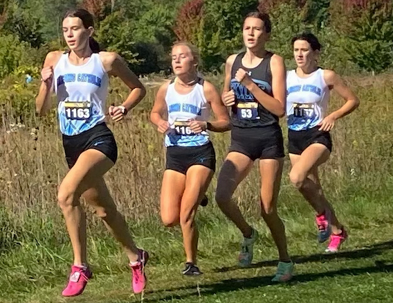 PHOTOS (Top) From left, Lansing Catholic’s CC Jones (749), Tessa Roe (745) and Hannah Pricco (755) lead the pack during a race. (Middle) Pricco, Jones and Roe help set the pace during another race. (Photos courtesy of the Lansing Catholic girls cross country program.)