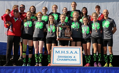 PHOTOS: (Top) Bailley McConnell (1858) and sister Cammie McConnell (1859) help push the pace during last fall's MHSAA Lower Peninsula Division 4 Final. (Middle) Sacred Heart, posing with its 2016 championship trophy, returns six of seven runners this fall. (Photos by Matt Yacoub & Janina Pollatz/RunMichigan.com.)