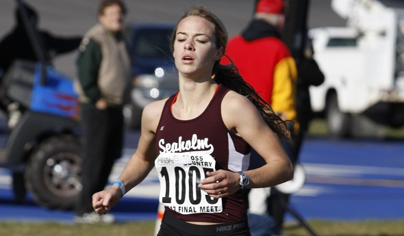 PHOTO: Birmingham Seaholm senior Aubrey Wilberding crosses the finish line first for her team, in 17:55.9, as the Maples went on to win the Division 1 team championship at MIS. (Click to see more from HighSchoolSportsScene.com).