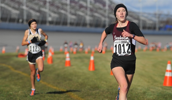 PHOTOS: Birmingham Seaholm’s Rachel DaDamio keeps pace ahead of Karenna Duffey of Macomb L'Anse Creuse North to finish individual runner-up and help the Maples regain the MHSAA LP Division 1 team title. (Below) Seaholm’s Audrey Belf claimed her second straight individual championship. (Click to see more from RunMichigan.com.)