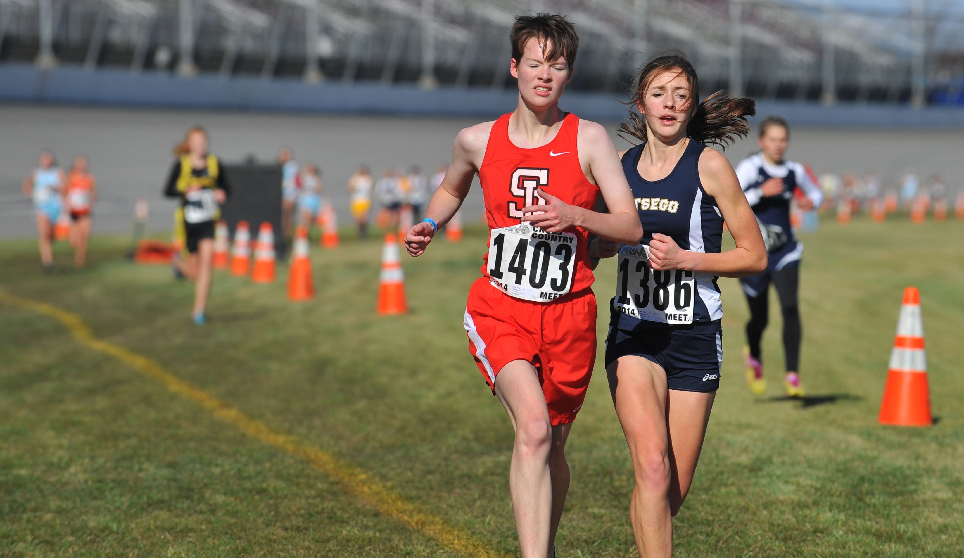 PHOTOS: (Top) St. Johns’ Karrigan Smith holds off Cedar Springs’ Kenzie Weiler during the final stretch of Saturday’s Division 2 race. (Below) Otsego’s Megan Aalberts works to stay ahead of Spring Lake’s Erin O’Keefe as they race for fourth place; Aalberts held on to help her team to its best Finals finish. (Click to see more from RunMichigan.com.)