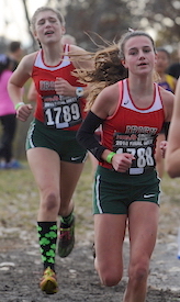 PHOTOS: (Top) Muskegon Western Michigan Christian freshman Abby VanderKooi charges through the finish of her first MHSAA Finals championship run. (Middle) Mount Pleasant Sacred Heart’s Desiree McConnell (1789) and Lauren MacDonald push through a straightaway in helping the Irish to another team title. (Click for more from RunMichigan.com.)