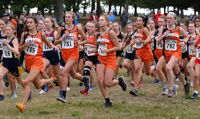 PHOTOS: (Top) Ishpeming's Lola Korpi (823) and Houghton's Ingrid Seagren (785) lead the Queen City Invitational. (Middle) Seagren and Paige Sleeman (787) race through the opening stretch with their teammates at the start of the Queen City race. (Photos by Cara Kamps.)
