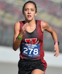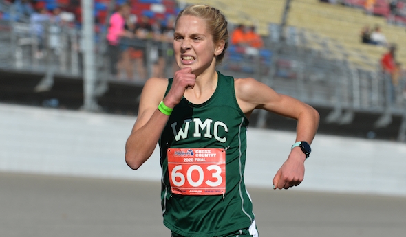 PHOTOS: (Top) Western Michigan Christian’s Abby VanderKooi closes in Saturday on her third MHSAA Finals championship. (Middle) Hart freshman Audrianna Enns approaches the finish line leading for the eventual team champ. (Click for more from RunMichigan.com.)