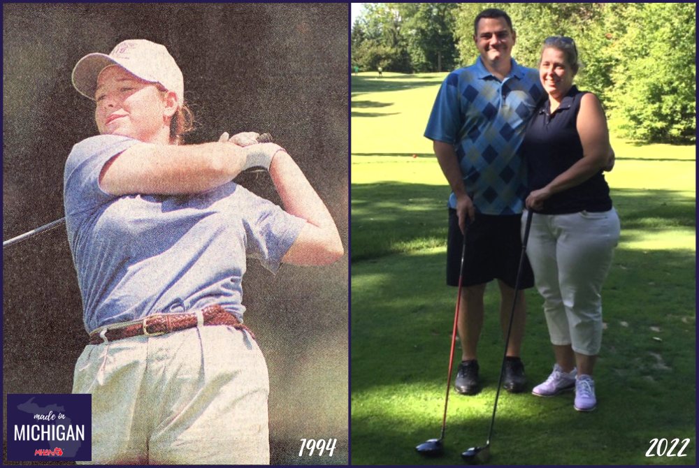 PHOTOS (Top) At left, Katy Loy watches a drive during the 1994 Lower Peninsula Girls Golf Final. At right, Loy, now Nightwine, with her husband Bryan. (Middle) Katy Nightwine takes a swing at the driving range. (Below) Katy and Bryan Nightwine. (1994 Finals photo courtesy of Ann Arbor News/MLive; current photos courtesy of Katy Nightwine.)