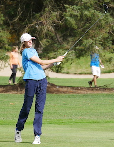 PHOTOS: (Top) Forest Hills Northern’s Chloe Johnson rolls a putt during Saturday’s second round. (Middle) Marian’s Shannon Kennedy watches one of her drives on the way to claiming the medalist honor. (Photos by Wes Morgan.)