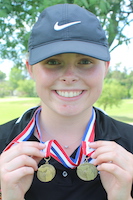 PHOTOS: (Top) A 20-minute downpour left large ponds of water scattered around the back nine at Escanaba Country Club during Thursday's Upper Peninsula Division 1 girls golf tournament. Tourney medalist Paxton Johnson's reflection is shown as she pushes her cart on the 14th fairway. (Middle) Johnson holds up her individual and team championship medals. (Below) Kaaren Liston of Houghton watches as her chip shot tumbles toward the hole Thursday. She tied for second. (Photos by Dennis Grall.)