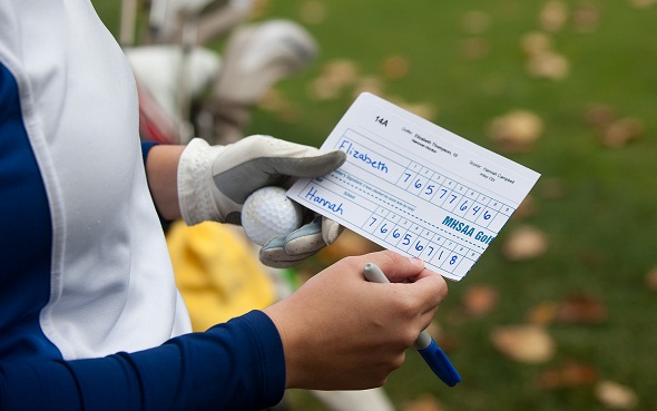 PHOTO: (Top) Lansing Catholic's Jacqueline Setas (left) and Kalamazoo Hackett's Abby Radomsky line up a putt during Saturday's final round. The Cougars finished first and the Fighting Irish runner-up. (Middle) Muskegon Catholic Central's Aya Johnson finished as the individual champion after defeating Setas in a one-hole tie-breaker. (Below) Hannah Campbell views her scorecard, which includes a notation for her hole-in-one. (Click to see more from HighSchoolSportsScene.com.)