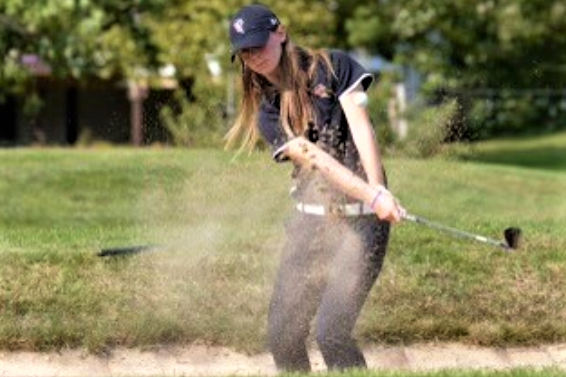 PHOTOS: (Top) East Kentwood’s Elise Fennell follows a drive. (Middle) Fennell, hitting out of the sand, is looking to build on last season’s fourth-place finish in LP Division 1. (Photos by Josh Fennell and Jim Swoboda, respectively.)