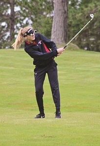 PHOTOS: (Top) Escanaba’s Sam Henderson, left, finished fourth individually while Houghton’s Kaitlyn McKay just missed placing among the top 10 individuals. (Middle) Aspen Micheln watches one of her shots for third-place Marquette. (Photos by Rachel Oakley.)