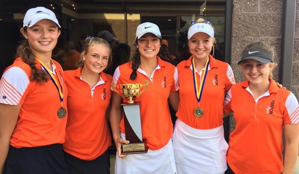 PHOTOS: (Top) From left, Fenton's Keegan Miller, Brooke Herbstreit, Margaret Berry, Molly Gundry and Lily Horning hold up their trophy after winning the Genesee County championship this month. (Middle) Miller watches one of her shots during last season's LP Division 2 Final, where the Tigers finished ninth. (Top photo courtesy of Fenton girls golf, bottom by HighSchoolSportsScene.com.)