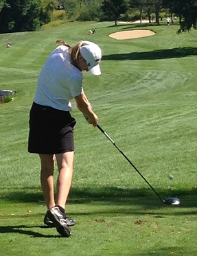 PHOTOS: (Top) Maple City Glen Lake's Nichole Cox watches a shot during last season's Lower Peninsula Division 4 Final. (Middle) Cox unloads a tee shot during another 2014 event. (Middle photo courtesy of Glen Lake High School.)