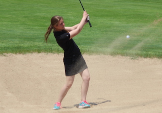 PHOTOS: (Top) The Houghton girls golf team poses with its MHSAA championship trophy, the fifth straight won by the program. (Middle) Kaaren Liston of Houghton chips out of the rough around the green Thursday at the Upper Peninsula Division 1 Final at Iron Mountain Pine Grove Country Club. Liston claimed medalist honors with a 90 to lead the Gremlins. (Below) Sam Henderson of Escanaba blasts out of a bunker on the eighth hole. She shot 112 to help the Eskymos finish third. (Photos by Dennis Grall.)
