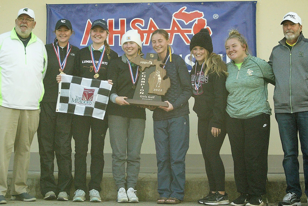 PHOTOS (Top) Sophomore Mia Melendez tees off at the 2022 MHSAA Division 4 Girls Golf Finals. (Middle) Jackson Lumen Christi wins the 2022 Division 4 team title. (Photos by Greg Chrapek.)