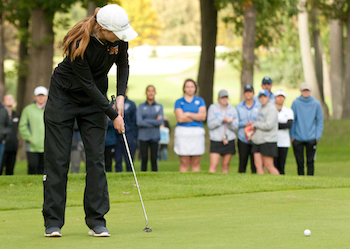 PHOTOS: (Top) Grand Rapids NorthPointe Christian celebrates its first MHSAA Finals championship in girls golf Saturday. (Middle) Harbor Springs’ Jacque O’Neill putts during a playoff hole; she won the hole and the individual championship. (Click to see more from HighSchoolSportsScene.com.)