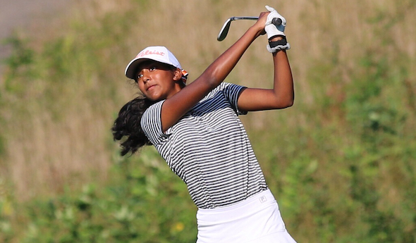 PHOTOS: (Top) Northville junior Megha Vallabhaneni keeps her eyes on an approach. (Middle) Senior Katelyn Tokarz sends a putt toward the hole. (Below) Sophomore Samantha Coleman follows an iron shot. (Photos by Debbie Stein.)