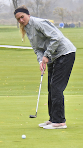 PHOTOS: (Top) Harbor Springs senior Madi Bezilla follows her shot during Saturday’s second round of the Lower Peninsula Division 4 Final at The Meadows. (Middle) Brooklyn Columbia Central’s Alissa Fish lines up a putt. (Click to see more from HighSchoolSportsScene.com.)