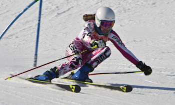 PHOTOS (Top) Traverse City Central’s Quinn Gerber finishes a giant slalom run Monday at Nub’s Nob. (Middle) Canton’s Lucy Savoie races the slalom course. (Below) A skier breaks past a gate also during the slalom. (Click for more from Tori Burley – photos to be added throughout this week.)