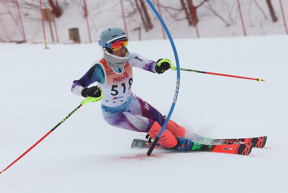 PHOTOS (Top) Traverse City Central’s Quinn Gerber finishes a giant slalom run Monday at Nub’s Nob. (Middle) Canton’s Lucy Savoie races the slalom course. (Below) A skier breaks past a gate also during the slalom. (Click for more from Tori Burley – photos to be added throughout this week.)