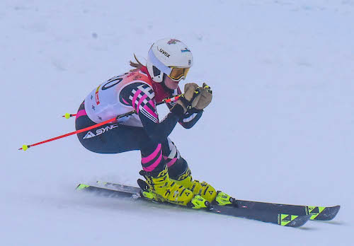 PHOTOS (Top) Traverse City Central’s Quinn Gerber finishes a giant slalom run Monday at Nub’s Nob. (Middle) Canton’s Lucy Savoie races the slalom course. (Below) A skier breaks past a gate also during the slalom. (Click for more from Tori Burley – photos to be added throughout this week.)