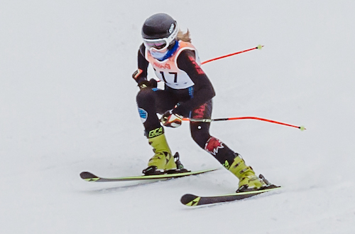 PHOTOS (Top) Traverse City Central’s Quinn Gerber finishes a giant slalom run Monday at Nub’s Nob. (Middle) Canton’s Lucy Savoie races the slalom course. (Below) A skier breaks past a gate also during the slalom. (Click for more from Tori Burley – photos to be added throughout this week.)