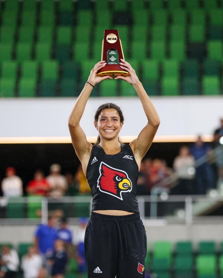 PHOTOS (Top) Clockwise from left, Gabriela Leon competes for the East Kentwood and University of Louisville track & field teams, and Maia Perez plays soccer for East Kentwood and trains for the NWSL's Angel City FC. (Middle) Leon holds up her NCAA championship trophy in June. (Below) Perez is one of three keepers for Angel City FC. [Photos courtesy of East Kentwood's athletic department (2017 soccer), Run Michigan (2017 track & field), the Louisville athletic department (2022 track & field) and Will Navarro/Angel City FC (2022 soccer).]