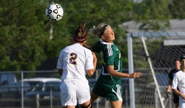 PHOTOS: (Top) Calvin Christian senior Jenny Holsem (6) deflects the ball during Thursday’s Regional Final against Kalamazoo Christian. (Middle) Squires coach Tim TerHaar presents the trophy to his team after the 7-2 win over the Comets. (Photos courtesy of Calvin Christian soccer.)