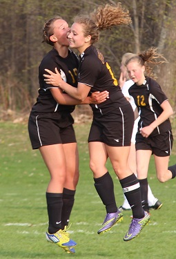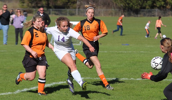 PHOTOS: (Top) Leland's Libby Munoz (14) splits a pair of Kingsley defenders and punches in the record-setting 196th goal of her career May 2. (Middle) Munoz celebrates with a teammate. (Photos by Jason Bushen/Leelanau Enterprise.)