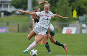 PHOTOS: (Top) Flint Powers Catholic’s Rachel Rasins (20) battles Freeland’s Hannah Doran for possession Saturday. (Middle) Powers’ Kennedy Myers winds up for a shot.