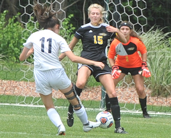 It was Woodbeck, who has attended Shrine but played high-level club soccer with the Michigan Hawks up until this spring, who actually got things going for the Knights. She capitalized on a free kick with 24:11 to play in the first half. Drawing the penalty just moments earlier, Woodbeck sent a shot curling up and over Kalamazoo Christian goalkeeper Jenna Blackwell’s outstretched hands to break the ice for her team.