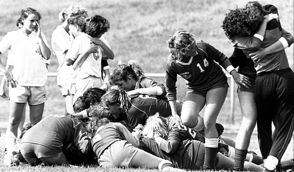 PHOTOS: (Top) Saginaw Eisenhower players celebrate after their 3-2 win over Plainwell in the 1987 Class B Final. (Middle) Salem players surround coach Ken Johnson and their newly-earned Class A title trophy after winning 2-1 over Livonia Churchill.