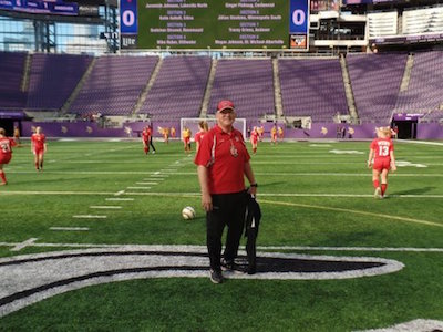 PHOTOS: (Top) Bangor girls soccer coach Dennis Yunke shares a light moment with, from left, Gisella Lorenzo, Olivia Moore and Janet Ibarra. (Middle top) Yunke, Mankato West girls varsity coach Christina Makela, Bangor athletic director Mary Spade. (Middle below) Yunke walks the field at U.S. Bank Stadium in Minneapolis before Mankato West’s state championship game. (Below) Ibarra pushes the ball upfield during a game. (Bangor and Mankato soccer practice and game photos courtesy of Dennis Yunke.)