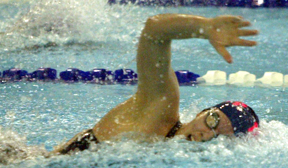 PHOTOS: (Top) East Grand Rapids’ Ileah Doctor swims her record-breaking 50-yard freestyle Saturday. (Middle) Bloomfield Hills Marian’s Lauren Biglin swims the winning 500 freestyle. (Below) Milan’s Madelyn Cislo swims to her meet record time in the 200 individual medley. (Click to see more from HighSchoolSportsScene.com.)