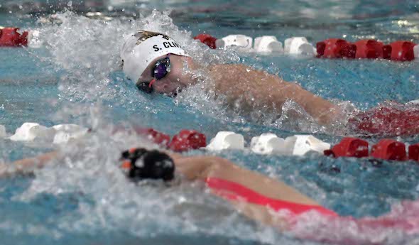 PHOTOS: (Top) Birmingham Seaholm's Samantha Clifford, top, swims toward one of her four top-three individual or relay finishes at Saturday's Division 2 Finals. (Middle) St. Joseph's Sylvia Park swims her leg of the 200 medley relay. (Click to see more from HighSchoolSportsScene.com.)