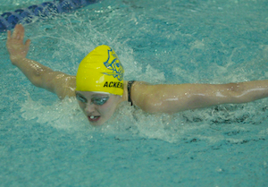 PHOTOS: (Top) Farmington Hills Mercy cheers on its 400 freestyle relay, which finished third to give the team a ½-point overall championship win. (Middle) Hudsonville’s Claire Tuttle swims to her third-straight 100 breaststroke championship. (Below) Grand Haven’s Kathryn Ackerman swims to her third-straight title in the 200 IM. (Click for more from HighSchoolSportsScene.com.)