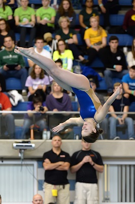 PHOTOS: (Top) Waterford United junior Miranda Tucker finishes up a record-setting swim of the 100 breaststroke. (Middle) Saline freshman Amy Stevens won the diving championship at her first MHSAA Finals. (Click to see more from HighSchoolSportsScene.com.)