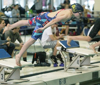 PHOTOS: (Top) The Standish-Sterling girls swimming & diving team huddles up during a meet this fall. (Middle) Sierra Maison launches at the start of the 200 IM consolation final during last season’s Lower Peninsula Division 3 Finals at Holland Aquatic Center. (Top photo courtesy of the Standish-Sterling girls swimming & diving program; middle by HighSchoolSportsScene.com.)