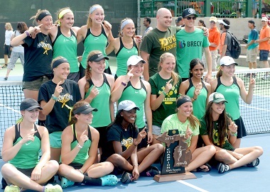 PHOTOS: (Top) A Midland Dow tennis player returns a shot during Saturday's Division 1 Finals at Greater Midland Tennis Center. (Middle) The Chargers pose with their first championship trophy since 2009. (Click to see more from HighSchoolSportsScene.com.)