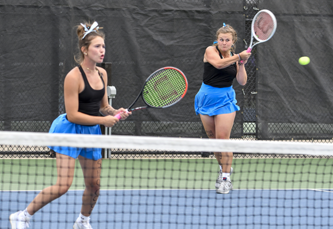 PHOTOS (Top) Forest Hills Central’s Lily Ohlman returns a volley during her No. 1 singles championship match Saturday. (Middle) Forest Hills Northern’s Paige McKenzie, right, with partner Ryan Morey, sends back a powerful volley at No. 1 doubles. (Click for more from High School Sports Scene.)
