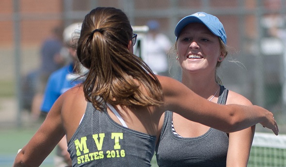 PHOTOS: (Top) Bloomfield Hills Marian's Regan Patterson (right) and McKenna Landis celebrate their doubles championship during Saturday's Lower Peninsula Division 2 Finals. (Middle) Okemos' Alisa Sabotic returns a shot on the way to winning the No. 1 singles title. (Click to see more from HighSchoolSportsScene.com.)