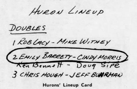 Turns out, Larry and the girls won their case. In Federal District Court, Judge Keith listened to what was said and issued a preliminary injunction allowing the girls to play. A little later in the week, Emily and Cindy won their first varsity doubles match hosted in Battle Creek, much to the dismay of their male opponents.