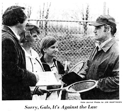 The next month, the Michigan Legislature adopted a bill allowing girls to compete on male teams, but only in non-contact sports. In late May, the doubles team of Emily and Cindy defeated a doubles team from Harry Hill, 6-3, 6-1.