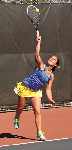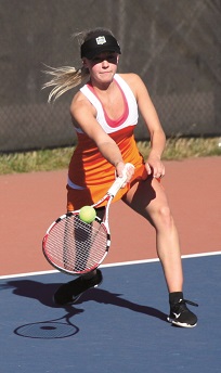 PHOTOS: (Top) Negaunee's Allison Ring defeated Hannah Beversluis of Escanaba in the No. 2 singles final 6-3, 6-2. (Middle) Kingsford's Katy Hicks unleashes her powerful serve at No. 1 singles against Negaunee's Angela Ring. Ring won 1-6, 6-2, 6-3. (Below) Escanaba's Taylor Gauthier at No. 3 singles faces Negaunee's Megan Syrjala. Gauthier won 6-4, 6-4. (Photos by Keith Shelton.)