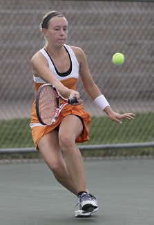 PHOTOS: (Top) Negaunee No. 1 doubles player Mykenna Kontio returns a shot during Wednesday’s Division 1 Finals at Kingsford. (Middle) Escanaba senior Taylor Gauthier volleys on her way to a No. 1 singles championship. (Photos by Adam Niemi.)