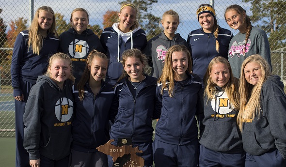 PHOTOS: (Top) Negaunee won its fifth straight MHSAA Finals championship Thursday. (Middle) Marquette’s Elysa Olivier returns a volley on the way to claiming the No. 1 singles title. (Photos by Adam Niemi.)