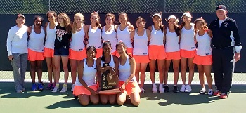 PHOTOS: (Top) Bloomfield Hills' Tia Mukherjee prepares to return a shot during her No. 1 singles match Saturday. (Middle) Northville poses with its latest MHSAA Finals trophy. (Click to see more from HighSchoolSportsScene.com.)