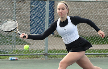PHOTOS: (Top) West Iron County’s Olivia Mazurek fires a backhand during a No. 1 singles match Thursday. (Middle) Iron Mountain’s Claire Mongrain sends back a volley at No. 1 singles. (Photos by Theresa Proudfit.)