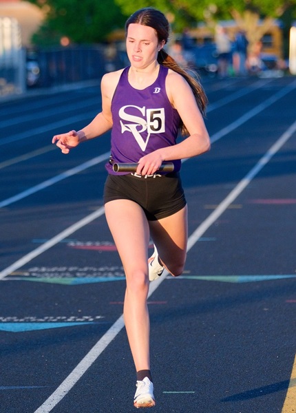 PHOTOS (Top) Saginaw Swan Valley’s Sydney Kuhn runs toward the finish during the Korf/Schultz Saginaw County Invitational on May 10 at Hemlock. (Middle) Kuhn anchors a relay during the Tri-Valley Conference Red meet May 8 at Frankenmuth. (Photos by Eagle Eye Photography.)